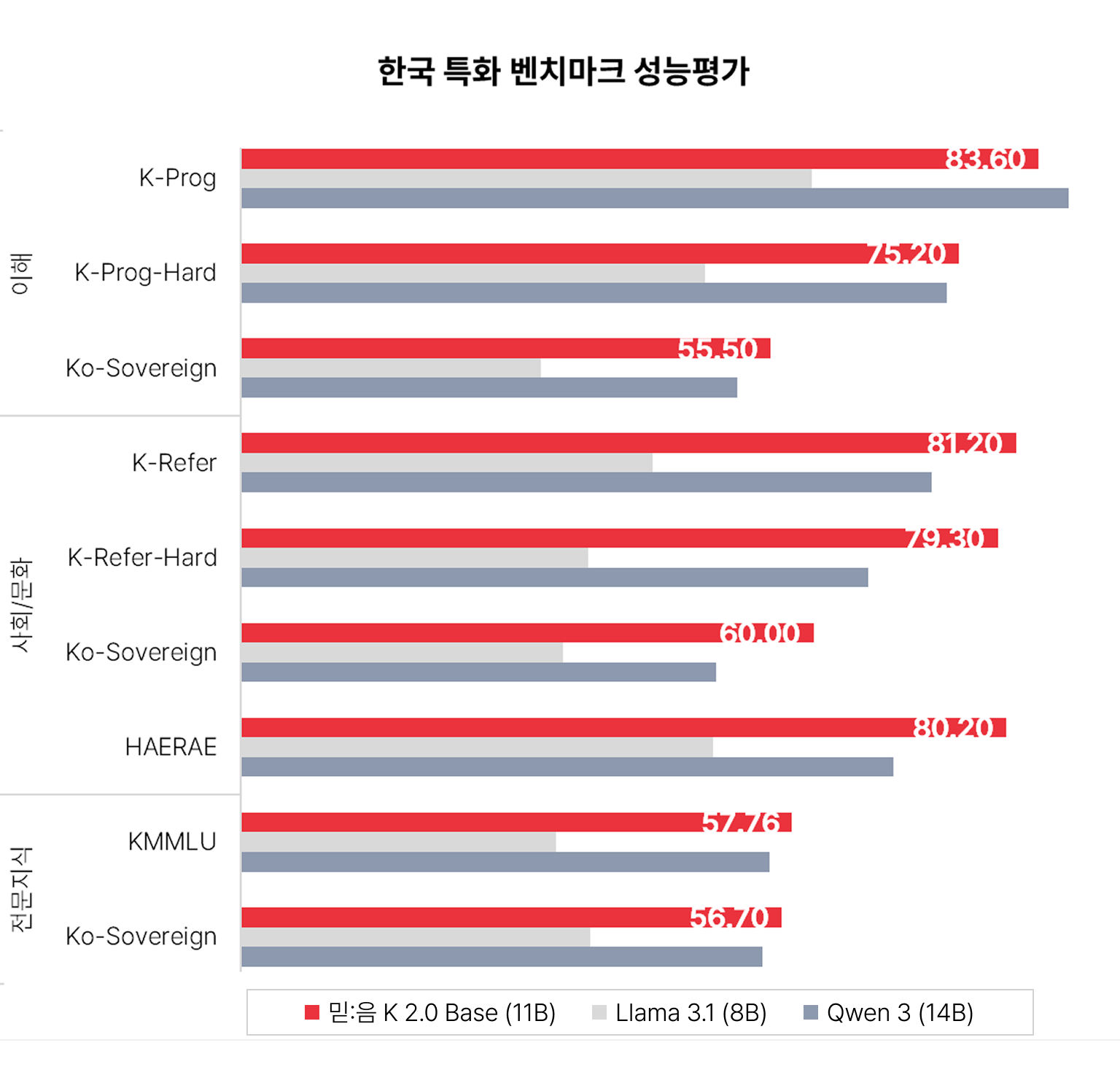 믿:음 K 2.0 Base는 역사, 법, 정치, 경제, 금융과 같은 전문 지식을 요구하는 고난이도 평가에서 20% 큰 규모의 SOTA 공개 모델인 Qwen-3(14B)의 성능을 능가합니다. 한국어 LLM 이해 성능을 평가하는 대표적인 오픈소스 벤치마크인 KMMLU 뿐만 아니라, KT와 고려대 민족문화연구원이 공동 설계한 한국적 벤치마크 Ko-Sovereign, 그리고 KT가 자체적으로 구축한 한국어 이해 벤치마크 3종 등에서 그 우수성을 입증했습니다.